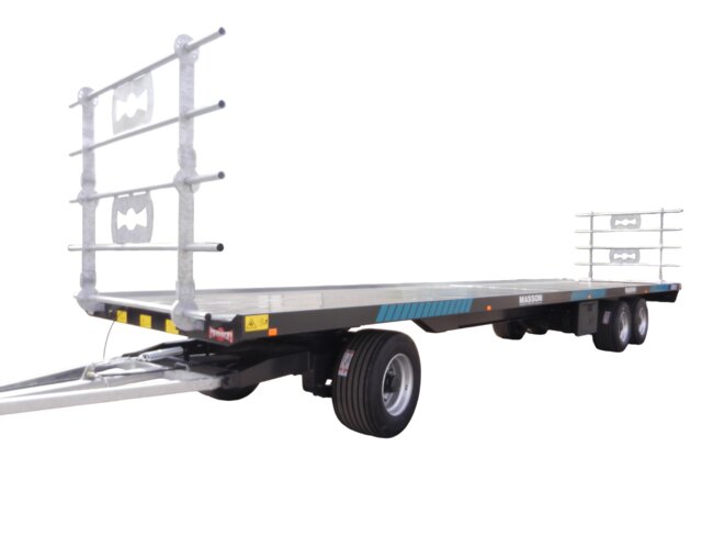 Plateau trainé 6 roues 12 mètres. Disponible avec freinage hydraulique double ligne 25 km/h, ou freinage pneumatique double ligne 40 km/h.